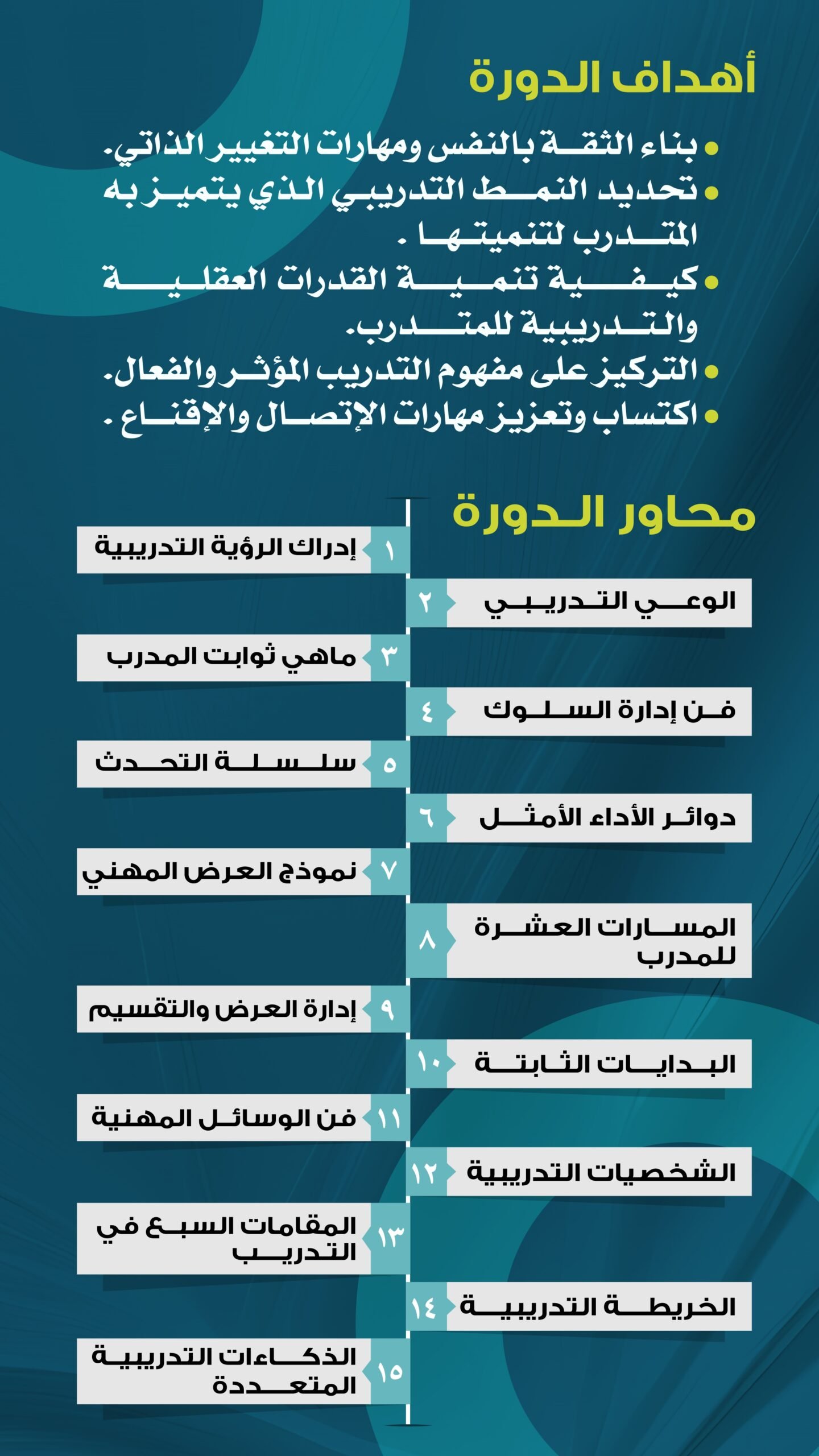 - اكتساب مهارات العرض والتقديم وترك أثر إيجابي فعال ودائم لدى المتدربين و التعامل مع الأنماط المختلفة من المتدربين.